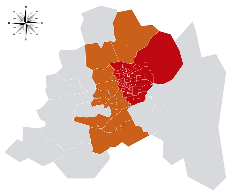 Comunas gran Santiago: Santiago, San Ramón, San Miguel, San Joaquín, Renca, Recoleta, Quinta Normal, Quilicura, Puente Alto, Providencia, Peñalolén, Pedro Aguirre Cerda, Ñuñoa, Macul, Lo Prado, Lo Barnechea, Las Condes, La Reina, Lo Espejo, La Granja, La Florida, La Cisterna, Independencia, Huechuraba, Estación Central, El Bosque, Conchalí, Cerro Navia, Cerrillos, Vitacura